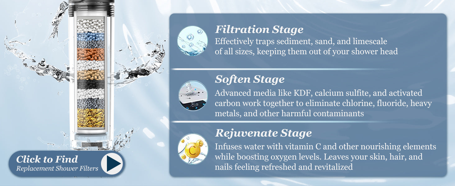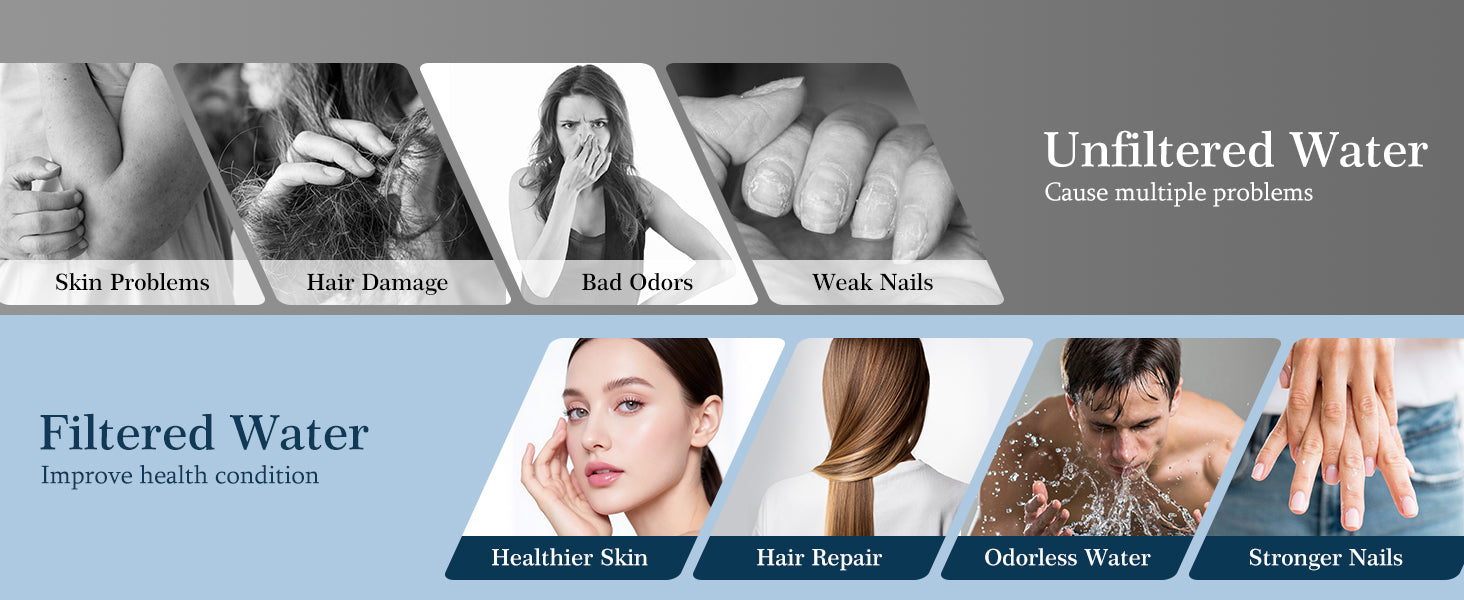 • 【Advanced Filtration System - Pure, Clean Water for Healthier Skin & Hair】As you can know, tap water contains residual chlorine, rust, heavy metals and other impurities. If we use unfiltered bath water for a long period of time, we may face various skin&hair problems. Now we can help solve those issues for you. Equipped with a powerful filtration system, including premium KDF-55, advanced calcium sulfite, activated carbon, vitamin C and more beneficial materials, our shower filters effectively removes up to 99.9% of chlorine, heavy metals and other harmful substances that can lead to dry skin, frizzy hair, color changes or other skin&hair problems