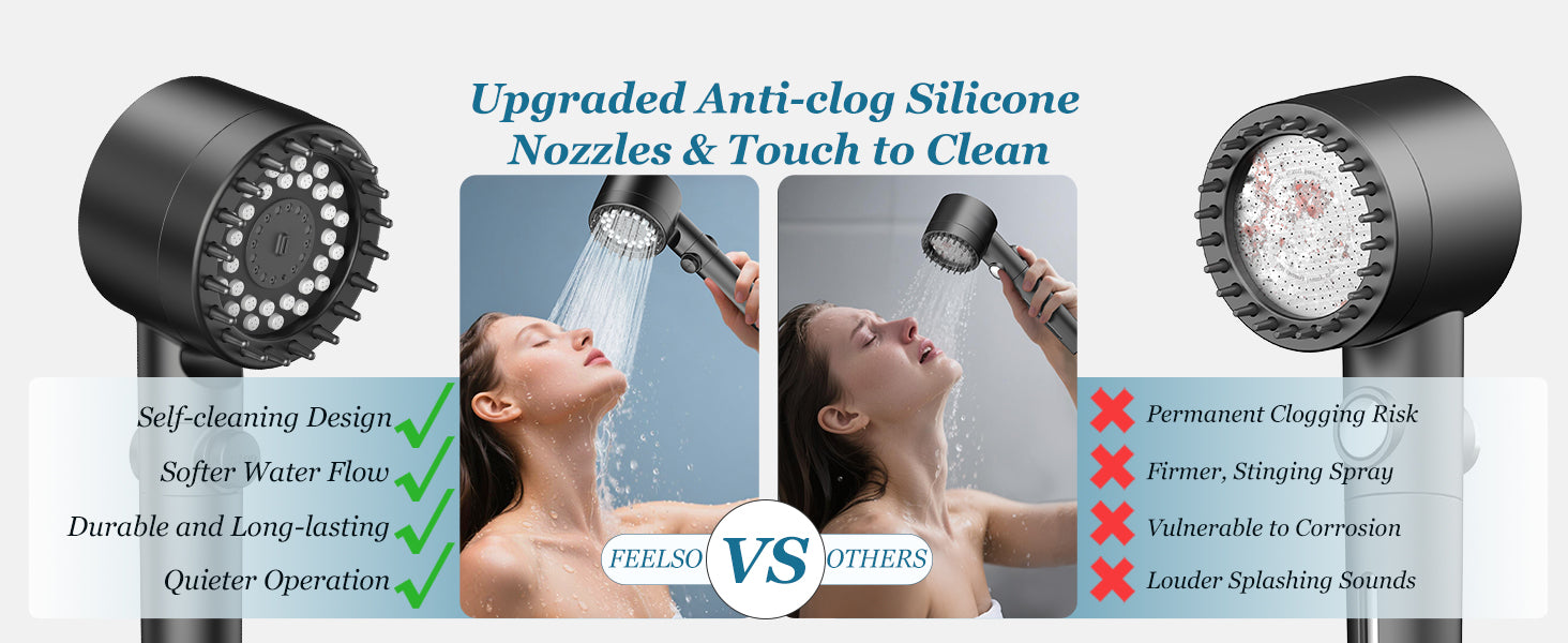 • 【Upgraded Anti-clog Silicone Nozzle - Never Deal with Clogged Jets Again】Frustrated with limescale and mineral buildup ruining your shower pressure? The FEELSO upgraded anti-clog shower head is here to help! Our upgraded silicone nozzle design prevents mineral buildup and maintains perfect water flow even in hard water areas. The self-cleaning silicone jets automatically resist limescale deposits, ensuring consistent high-pressure spray without maintenance for years. No more poking holes or vinegar soaks - simply enjoy a clog-free shower experience that lasts